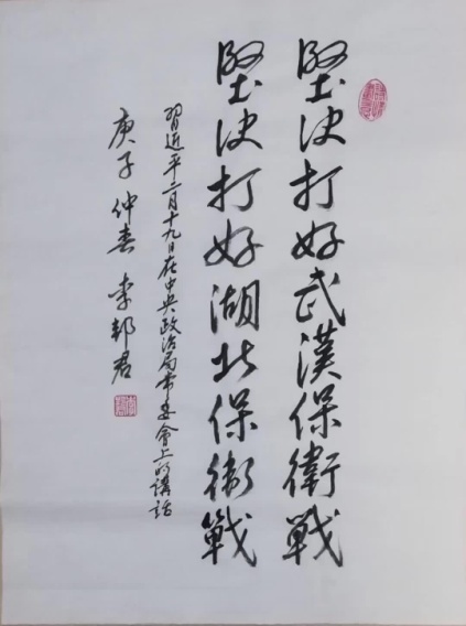 今年新型冠状病毒肺炎疫情来势凶猛,大年初一中央政治局常委会会议号召抗疫,李邦君教授一切听从党的指挥,宅家抗疫,并将原想围绕习近平元旦献词和春节贺词书写建成小康社会的内容主题,改变为抗疫“战”书。当天,李邦君教授以“坚决打好武汉保卫战、坚决打好湖北保卫战”一书上传微信朋友圈,以共产党员的坚定信念积极参加抗疫。