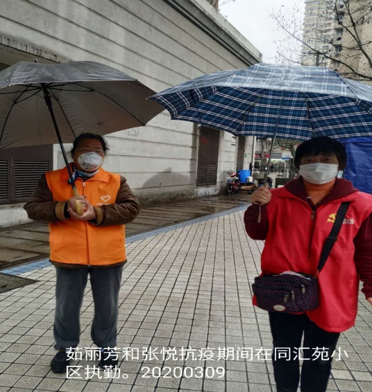 今年春节,一场突如其来的新冠肺炎疫情肆虐荊楚大地,武汉封城,张悦老师每天宅在家中看电视新闻,看到医护人员和医护用品告急,社区防控力量告急的消息,她的心情非常沉重,就想:“自己别的事情帮不了忙,能不能力所能及地就近在社区里帮助做点事情”。此时,“璀璨徐家汇”网站对社区党员发出志愿者应征的号召,张悦老师立即报名。张悦老师居住地所在的小区有六位党员报名参加,上班时间为每周一到周六,每天上午8:00~9:00上岗。疫情期间小区关闭了二个出入口,只留一个门进出,快递和送外卖人员都不允许进入小区,需要小区居民自己到门口取,进入小区的人员要登记和测体温才能进入,汽车也要每一辆都要登记,外来人员和车辆不可以进入,这些检查和防守工作都需要志愿者们协助完成。