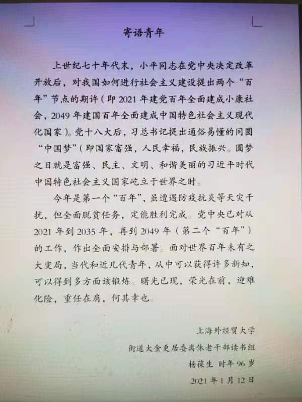 2021年是建党100周年,也是“十四五”开局之年。为迎接中国共产党成立100周年,教卫党委拟在系统离休干部中开展“百老寄语新党员”活动。我校离休干部积极参加活动,杨葆生老师以“寄语青年”一文;戴耀春老师和夫人乐安合作的“百年初心记胸怀”诗作参加“百老寄语新党员”征集活动,以表达老共产党员对年轻党员的殷殷寄语。