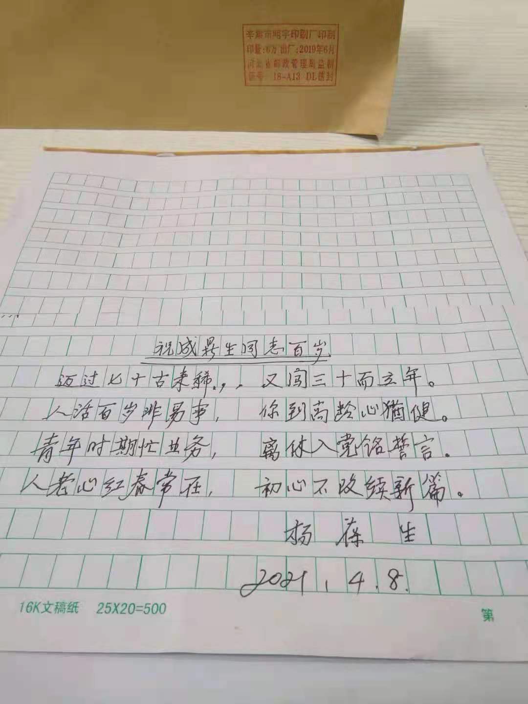 2021年是中国共产党成立100周年,离退休党委根据教卫工作党委、学校党委工作部署,认真落实“盛赞百年辉煌、助力百年征程”主题活动。活动通知下发,离休干部积极参加,除了杨葆生老师以“寄语青年”一文;戴耀春老师和夫人乐安合作的“百年初心记胸怀”诗作参加“百老寄语新党员”征集活动之外,宫福钧老师以“我跟党奋斗七十多年,靠的是信念;我们要不忘初心,继续奋斗,靠的也是信念;我期望年轻党员接过火炬,开始新的长征!”寄语,表达老共产党员对年轻党员的殷殷期望。