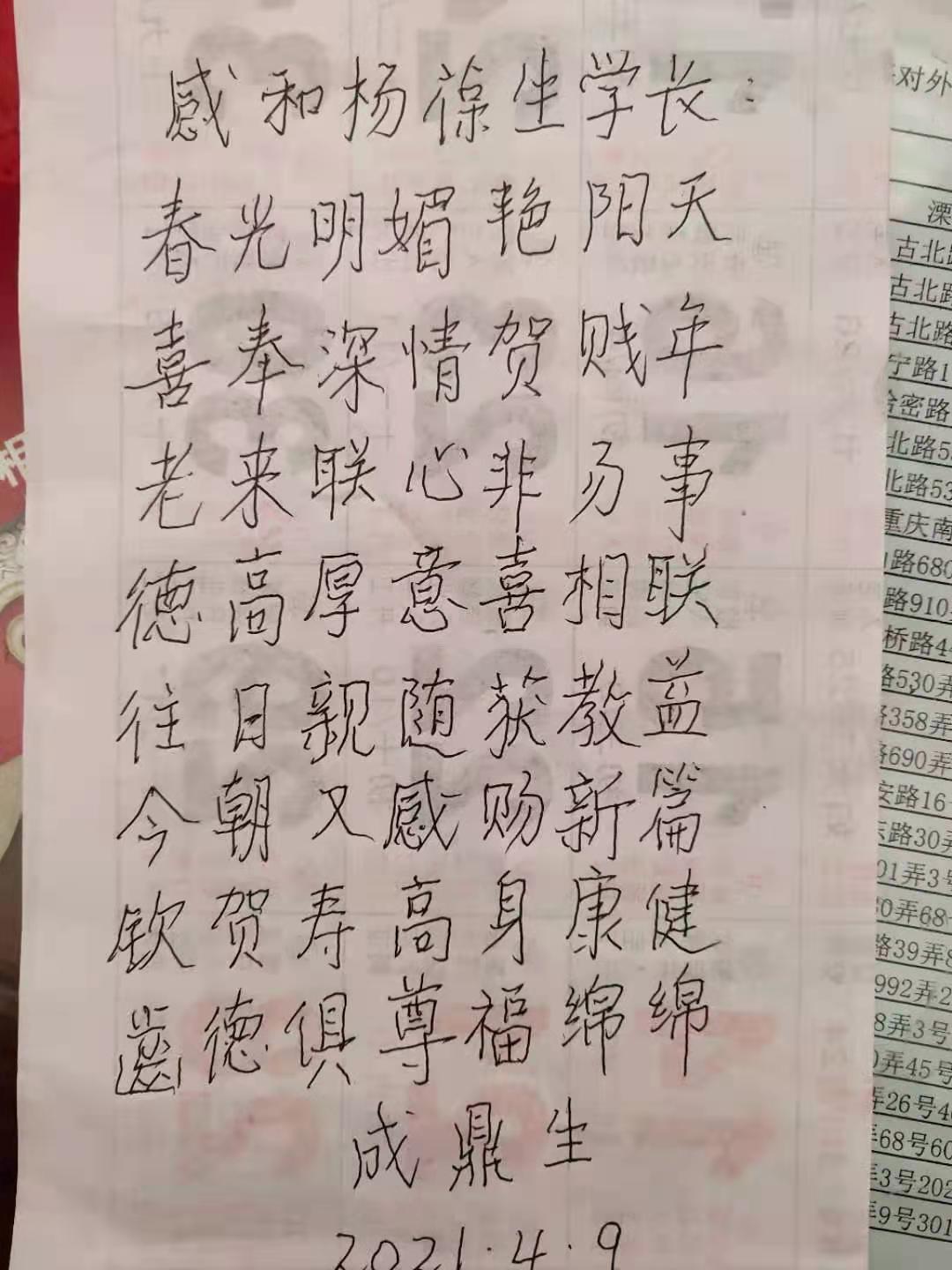 成鼎生老师收到祝福诗,非常感动。为表达感谢,回赠诗一首: