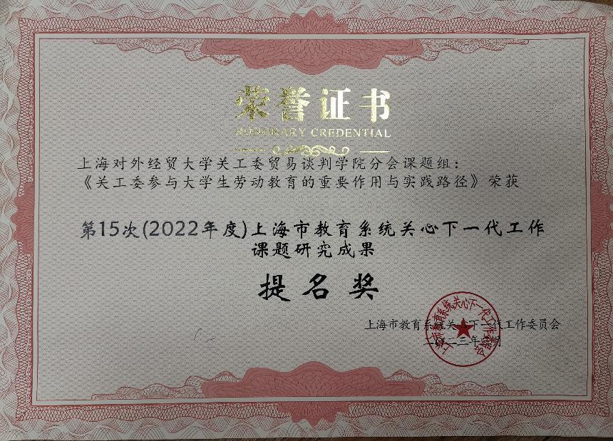 3月20日,上海市教育系统关工委召开优秀课题成果表彰推广会,我校关工委金融学院分会课题组和贸易谈判学院分会课题组的《新时代高校关工委工作与大学生思政教育融合的创新路径研究》、《关工委参与大学生劳动教育的重要作用和实践路径》两项课题分别获得2022年度上海市教育系统关心下一代工作课题研究成果三等奖和提名奖。