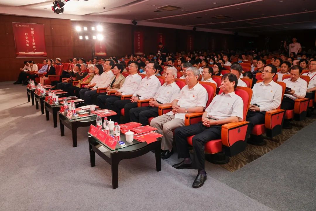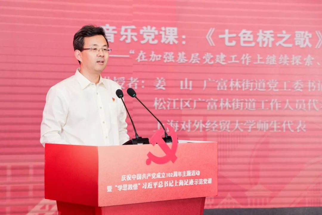 在中国共产党成立102周年之际,为深入学习贯彻习近平新时代中国特色社会主义思想,全面贯彻党的二十大精神和习近平总书记考察上海系列重要讲话精神,始终牢记习近平总书记的殷殷嘱托,弘扬伟大建党精神,6月30日下午,由上海对外经贸大学党委与松江区广富林街道党工委共同举办的“牢记嘱托跟党走 扬帆奋楫建新功”庆祝中国共产党成立102周年主题活动暨“学思践悟”习近平总书记上海足迹示范党课在上海对外经贸大学松江校区图文信息大楼507报告厅举行。松江区委常委、组织部部长时建英,上海对外经贸大学党委书记殷耀,上海对外经贸大学党委副书记、校长汪荣明,松江区广富林街道党工委书记、人大工委主任姜山,松江区广富林街道党工委副书记、办事处主任陈洁出席活动。地校双方领导班子成员、中层干部、各级党组织书记、党员代表、老同志代表、松江大学城兄弟高校代表等共同参加本次活动。学校全体党员师生和广富林街道社区居民线上观看学习。