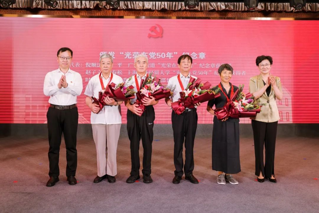 松江区委常委、组织部部长时建英,校党委副书记、校长汪荣明为“光荣在党50年”纪念章获得者颁章