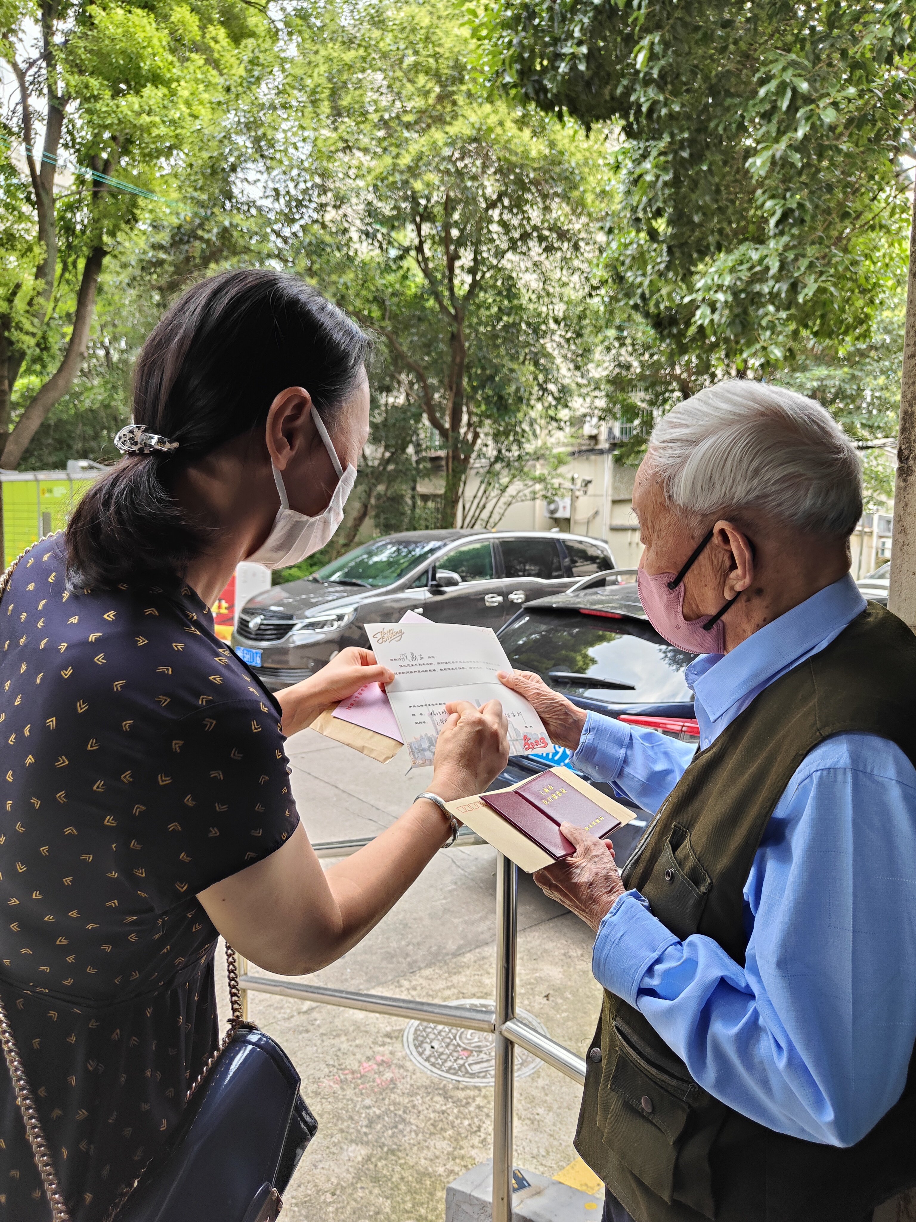 101岁的成鼎生老师疫情之后还是第一次迈出家门,老干部办公室为他转送上海市老干部局祝福百岁老人慰问信和慰问金,并祝他健康长寿。