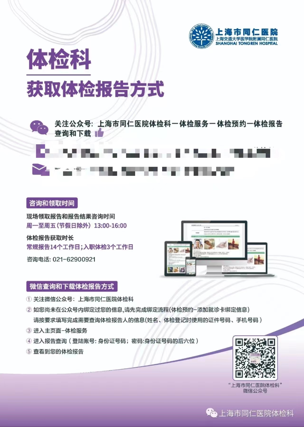 2、电子体检报告获取:通过关注上海市同仁医院公众号,可以获取电子版的体检报告,具体操作流程请见本通知的附件《电子体检报告获取流程》。