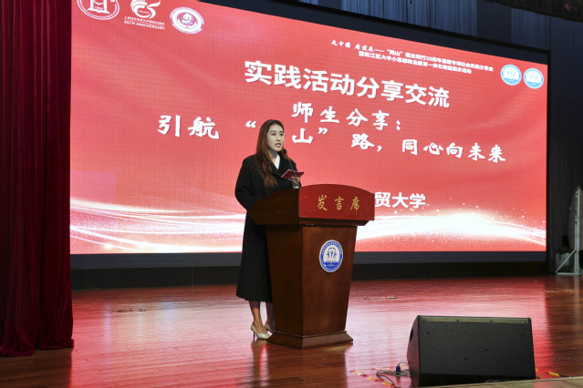 上海对外经贸大学马克思主义学院教师张朋林与研究生陈祺以“引航‘两山’路,同心向未来”为题进行分享,生动讲述了团队如何将理论与社会实践深度结合,深入田间地头开展调研的过程,全方位展现出“两山”理念在乡村、社区等基层一线落地生根、开花结果的生动图景。