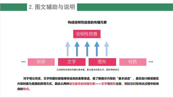 说明性信息的范畴为:出现在展示环境内,用以揭示展品内涵意义,传达展项核心信息的内容。通常以造型各异的图文版面、说明牌、视频界面等形式出现,说明、解释和扩充展示的内涵。