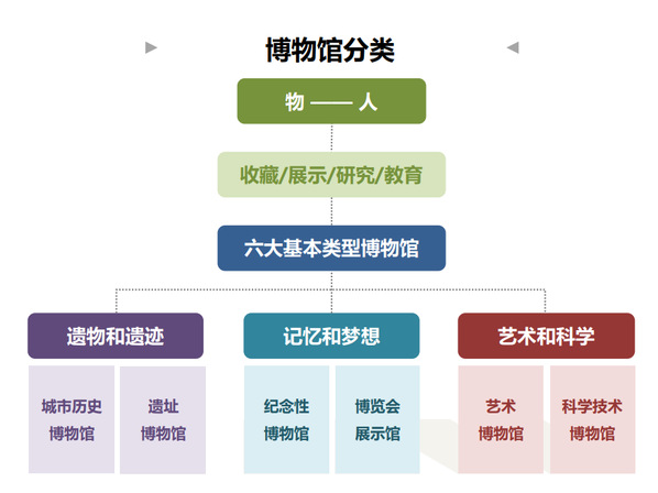 城市历史博物馆,从个性表达到公共叙事,例如上海博物馆、苏州博物馆。艺术博物馆,从视觉形象到艺术话题,例如刘海粟美术馆、浙江省美术馆等,可进一步细分为综合馆、当代馆、专类馆、纪念性馆。科学技术博物馆,有腾飞超越的综合馆,探索前沿的自然馆、天文馆,科技普及的行业科普馆。纪念馆可分为革命历史纪念馆和纪念性博物馆,革命历史纪念馆包括跑马会俱乐部、上海图书馆、上海美术馆、上海革命历史博物馆等,纪念性博物馆可进一步分为事件类馆和人物类馆,事件类馆例如中共一大纪念馆、龙华烈士陵园等,人物类馆例如鲁迅纪念馆、陈云纪念馆等。遗址博物馆是考古学的诠释。博览会展示馆展现了国家信心和品牌诉求,城市规划展示馆面向城市未来。和其他博物馆相比,高校博物馆更注重研究性和教育功能,例如上海中医药大学的中医药博物馆,复旦大学的复旦大学博物馆等。