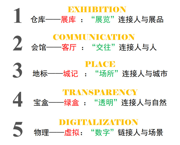 博物馆有五个转型方向,一是仓库——展库 :“展览”连接人与展品,展览文化推动空间设计转型;二是会馆——客厅 :“交往”连接人与人,交往方式推动服务设施转型;三是地标——城记 :“场所”连接人与城市,时空观念推动建筑设计转型;四是宝盒——绿盒 :“透明”连接人与自然,例如2022上海奉贤江海村“摩登田野”大棚美术馆;五是物理——虚拟:“数字”链接人与场景,例如2022届上海美术学院线上毕业创作展。