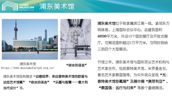 浦东美术馆位于陆家嘴滨江第一线。开馆之年,浦东美术馆与国际顶尖艺术机构与艺术家合作,包括泰特美术馆、米罗基金会,著名艺术家蔡国强等,为中外观众呈现“光:泰特美术馆珍藏展”及展中展“奥菲利亚”、“蔡国强:远行与归来”等数个重磅展览。