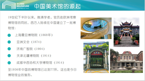 19世纪下半叶以来,晚清学者、官员赴欧洲考察博物馆的同时,西方人陆续在中国建立了一批博物馆,包括上海震旦博物院(1868年)、亚洲文会(1874)、济南广智院(1904)、天津北疆博物院(1914)、成都华西协和大学博物馆(1914),至1936年中国的博物馆已达到77所,这也是今日博物馆业的雏形。