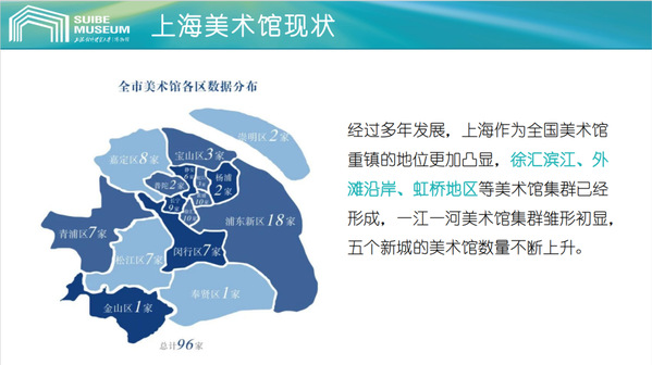 据市文化旅游局统计,2021年,上海美术馆数量达到96家,稳居全国城市首位,并实现16个区全覆盖。其中国有美术馆25家、非国有美术馆71家。2021年全年接待观众621万人次,同比增长53%。全市66家美术馆向公众免费开放,约占总数的68.8%。经过多年发展,上海作为全国美术馆重镇的地位更加凸显,徐汇滨江、外滩沿岸、虹桥地区等美术馆集群已经形成,一江一河美术馆集群雏形初显,五个新城的美术馆数量不断上升。