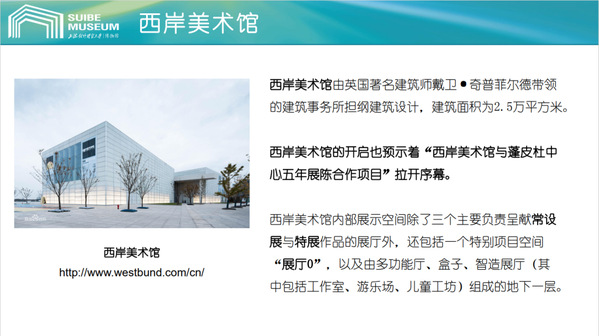 西岸美术馆由英国著名建筑师戴卫·奇普菲尔德带领的建筑事务所担纲建筑设计,建筑面积为2.5万平方米。2021年正值“抽象绘画的先驱”康定斯基诞辰155周年,西岸美术馆与逢皮杜中心倾力筹划,推出五年展陈合作项目的第三个特展“抽象艺术先驱:康定斯基”,全面呈现这位二十世纪艺术大师里程碑式的创作生涯。本次展览不仅是康定斯基于中国的首次大展,亦是迄今为止在亚洲境内最具规模的回顾展。