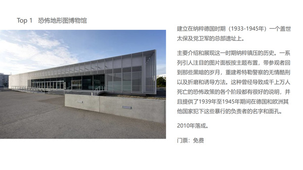 排名第一的恐怖地形图博物馆建立在纳粹德国时期(1933-1945年)一个盖世太保及党卫军的总部遗址上,主要介绍和展现这一时期纳粹镇压的历史。
