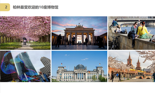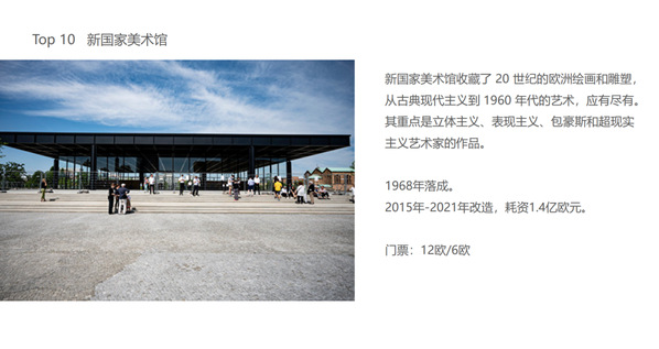柏林最受欢迎的10座博物馆排名从低到高分别是新国家美术馆、德国科技博物馆、佩加蒙博物馆、民主德国博物馆、马丁·格罗皮乌斯博物馆、新博物馆、未来科技馆、自然历史博物馆、洪堡论坛和恐怖地形图博物馆。