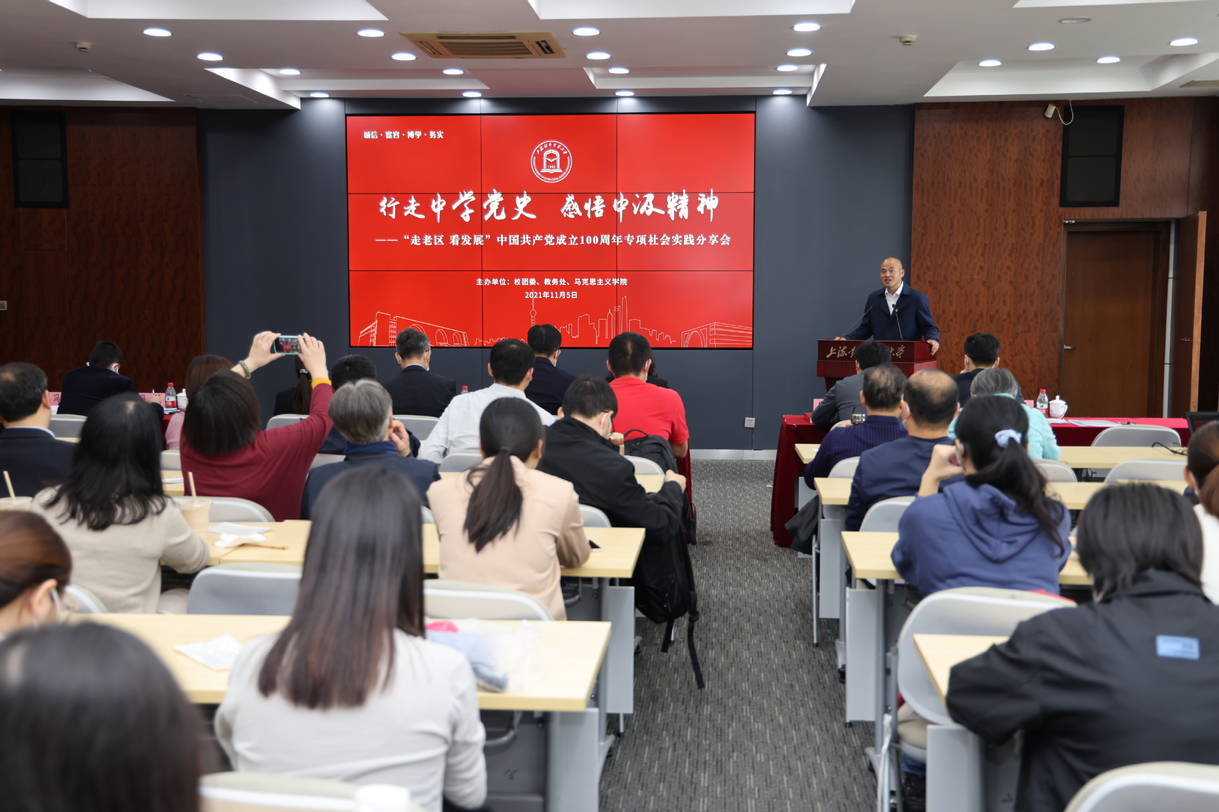 11月5日,马克思主义学院、校团委、教务处在信息楼503会议室联合举办以“行走中学党史 感悟中汲精神”为主题的“走老区 看发展”——中国共产党成立100周年专项社会实践分享会。校党委书记殷耀,副书记、副校长祁明,党委宣传部部长郭茜,教务处副处长(主持工作)朱建明,马克思主义学院院长秦淑娟,校团委、马克思主义学院、其他学院领导以及暑期社会实践获奖团队代表出席本次分享会。分享会由马克思主义学院党总支副书记刘海泉主持。分享会在本次专项社会实践的活动总结视频中拉开序幕。殷耀为社会实践优秀指导老师以及特等奖团队颁发了荣誉证书。祁明在讲话中,向获奖的队伍和优秀指导老师表示热烈的祝贺。他指出,本次“走老区,看发展”—— 中国共产党成立100周年专项社会实践是落实习近平总书记在“七一”讲话中提出“继续弘扬光荣传统、赓续红色血脉,永远把伟大建党精神继承下去、发扬光大”相关要求的有益探索和实践。本次开展的暑期专项社会实践体现出主题鲜明、调研内容丰富、成果丰硕等特点,取得了明显的成效和可喜的成绩。他提出三点希望,一是继续坚持结合党的理论创新成果,立足新时代中国特色社会主义鲜活实践,在社会实践中找准理论与实践