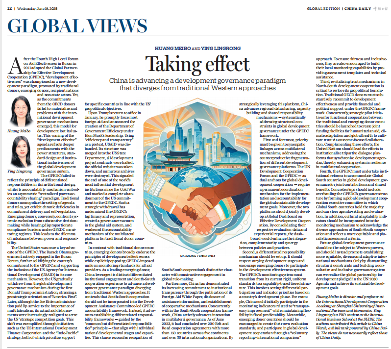6月18日,《中国日报》(China Daily)刊发了上海对外经贸大学国际发展合作研究院院长黄梅波教授与国际经贸学院博士生应玲蓉联合撰写的英文评论文章《Taking Effect—China is Advancing a Development Governance Paradigm that Diverges from Traditional Western Approaches》,呼吁重塑全球发展合作治理结构,推动构建更加公平、包容、多元的新型国际发展合作范式。文章指出,自2011年釜山论坛确立“发展有效性”原则以来,传统援助国在全球发展治理中仍掌握主导地位,但却未能实现责任的公平分担。GPEDC(全球有效发展合作伙伴关系)在制度设计中忽视了“差异化责任”原则,导致全球南方国家在规则制定与执行过程中长期处于边缘化地位,严重影响了合作的实质性成效。文章批评美国对全球发展合作的政策摇摆,从奥巴马时期强调多边合作,到特朗普政府削减援助预算,再到当前削弱USAID功能,反映了西方治理体系内部的不稳定与责任稀释。相较之下,中国近年来通过推进南南合作、发布对外援助白皮书、推动“一带一路”倡议