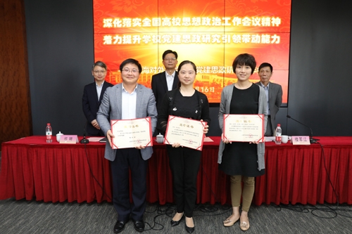 会上,祁明代表党建思政研究会理事会对2016年工作进行了总结,他从研究会的制度建设和机制完善以及规范运作和作用发挥两个方面介绍了在过去一年中所取得的工作成效。楼军江宣读了获奖情况通报,与会校领导为获奖者颁发证书。机关党委书记、组织部部长徐凯老师,金融管理学院党委书记、院长凌婕老师,马克思主义学院方旭光老师分别代表组织奖获得单位、2016年获奖课题作者以及2017年重点立项课题申报者从不同的角度作了交流发言。