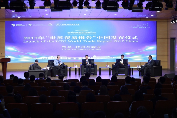 揭牌仪式后举行了2017年世界贸易报告中国发布仪式,仪式由世贸组织讲席特聘教授、我校贸易谈判学院院长张磊主持。世界组织首席经济学家Robert Koopman代表世贸组织发布并详细介绍了《2017年世界贸易报告——贸易、技术和就业》的主要内容,分析了贸易政策的变化和技术不断进步对世界经济、贸易和人们就业的影响。国家高端智库专家李光辉围绕主题对发布的2017年世界贸易报告作了点评,并发表了观点。