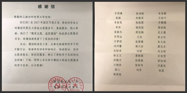 豫园街道党工委、办事处在感谢信中表示:贵校同学真诚服务,热心奉献,践行了“微笑志愿,温度豫园”的旅游志愿服务宗旨,给豫园游客留下了深刻的印象!在此,感谢贵校学子的辛勤付出,感谢贵校团委积极响应、快速联动,组织志愿者报名、培训及服务,树立了贵校学子良好的社会形象!