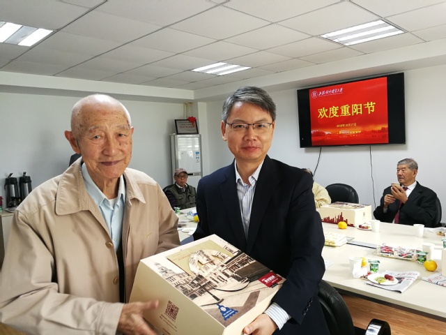 为离退休干部祝寿是我校一直坚持的工作。在欢乐祥和的气氛中,祁明向90岁寿星送上祝福和礼物,向与会的离休干部送上重阳糕点,并合影留念。