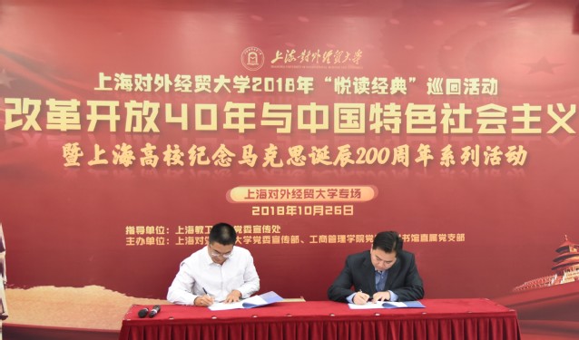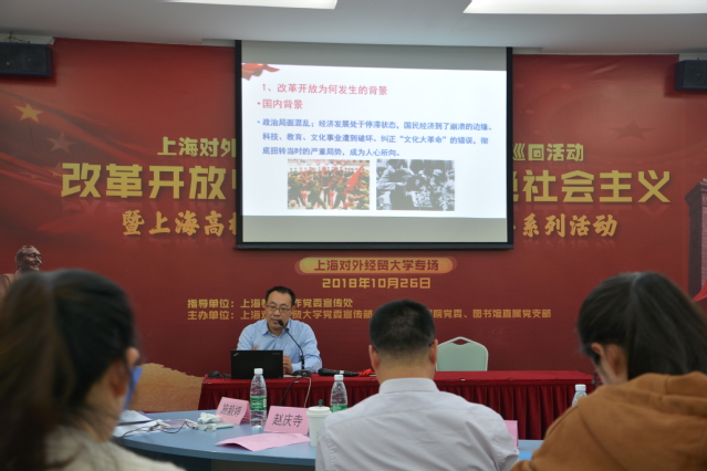 10月26日,由上海市教卫工作党委宣传处支持指导,校党委宣传部、工商管理学院党委、图书馆直属党支部联合主办的“悦读经典”巡回活动第五站——改革开放40年与中国特色社会主义暨上海高校纪念马克思主义诞辰200周年系列活动上海对外经贸大学专场在图文信息中心530会议室举行。校图书馆直属党支部书记赵勇、图书馆馆长王群、工商管理学院党委书记刘根春、华东政法大学教师工作部副部长赵庆寺教授以及图书馆直属党支部全体党员教师和工商管理学院全体党员师生参加活动。工商管理学院施毅婷主持本次活动。