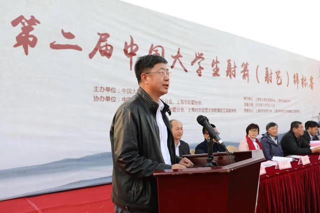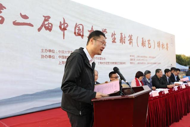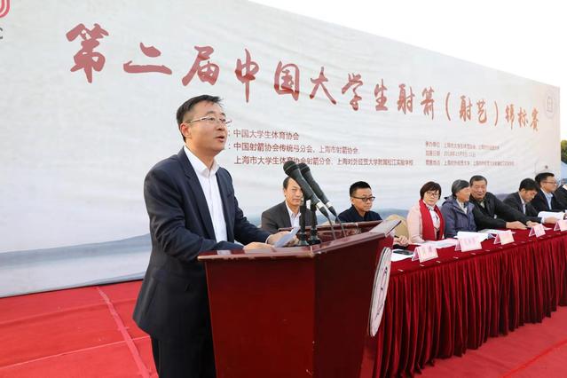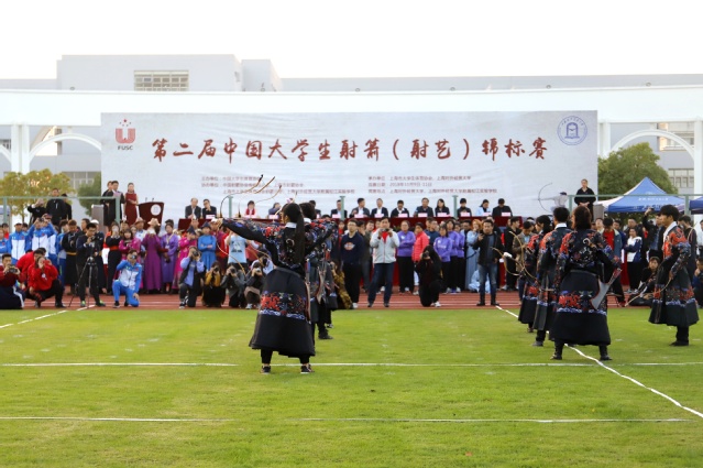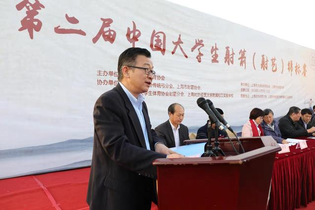 11月9日下午,第二届中国大学生射箭(射艺)锦标赛开幕式在我校体育场隆重举行。此次锦标赛由中国大学生体育协会主办,上海市大学生体育协会和我校承办,教育部学生体育协会联合秘书处秘书长、中国大学生体育协会主席薛彦青,国家体育总局射击射箭运动管理中心主任梁纯,中国大学生体育协会竞赛部主任程洁,国家体育总局射击射箭运动管理中心副主任、中国射箭协会副主席郑立勋,亚洲射箭协会联合会副主席、中国射箭协会传统弓分会常务副主席郭蓓,上海市教育委员会体卫艺科处处长丁力,国家体育总局射击射箭运动管理中心社会发展部部长白军华,上海市射击射箭运动中心主任王跃舫,上海市松江区体育局局长孔林德,我校副校长张道方,附属松江实验学校书记姚红贤等领导和嘉宾出席开幕式。开幕式由我校体育部主任崔树林主持。