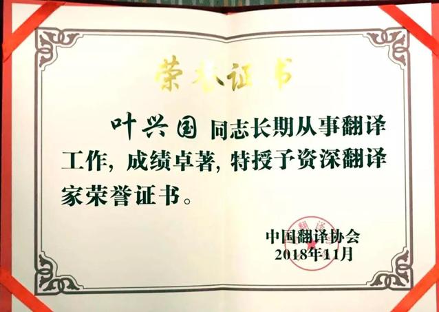 在11月19日召开的“改革开放40年与语言服务创新发展论坛暨2018年中国翻译协会年会”上,我校叶兴国教授荣获由中国翻译协会授予的“资深翻译家”称号并受表彰,这是叶兴国教授继今年8月份获得中国国际贸易学会商务英语研究会授予的“特殊贡献奖”之后获得的又一个荣誉称号。