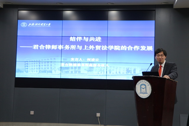 在主旨发言环节,君合律师事务所高级合伙人何凌云律师作了题为“结伴与共进——君合律师事务所与上海对外经贸大学合作发展”的主旨发言;北京市金杜律师事务所上海分所华东地区管理合伙人陈青东律师作了题为“与时俱进,铸金新时代”的发言;上海市浦东新区人民法院金融庭庭长王鑫法官作了题为“法官的职业要求与人才培养”的主旨发言;海市第一中级人民法院副院刘力法官做了题为“以实证视角论裁判教学方法反思与重构”的主旨发言。