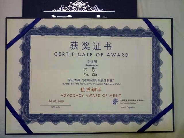 2019年2月23日至24日,由中国国际经济贸易仲裁委员会主办、商务部条法司支持的首届“贸仲杯国际投资仲裁赛”在西安交通大学举行。经过两天共28场庭审辩论的激烈角逐,我校代表队先后与来自山东大学、复旦大学、四川大学等国内知名高校的参赛队伍展开较量,最后我校代表队荣获优秀团队奖,其中沙莎荣获优秀辩手奖。