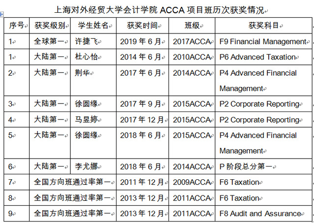 ACCA是目前全球规模最大的国际会计师资格证书。2017年《上海金融领域“十三五”人才发展规划》中将ACCA会员列入上海金融领域“十三五”紧缺人才开发目录。我校ACCA方向班自2010年成立以来成绩斐然,已连续七次获得ACCA白金级最高质量认证,并于2019年6月获得ACCA全部13门考试中九门课程考试免考资格,成为全国范围内在本科阶段获得该免试资格的第三所高校(注:目前中国大陆地区仅有三所高校具备本科阶段ACCA九门免考资格);我校于2014、2017和2018三年被评为ACCA年度优秀高校,于2018年荣获“ACCA中国卓越教育机构成就奖”。