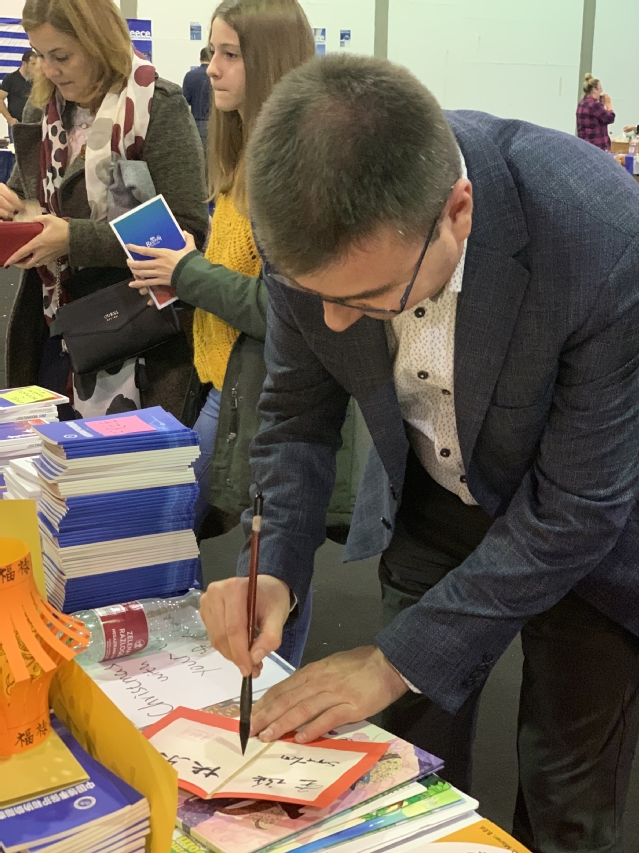 义卖现场气氛热烈,人头攒动,歌舞阵阵。中国使馆的展台位于现场中心位置,在鲜艳的五星红旗、喜庆的大红灯笼和充满中国元素背景板的映衬下格外醒目。来到中国使馆展台,首先映入眼帘的就是萨大孔院教师们的现场书法表演、手工制作展示和各种自制的义卖品。许尔文大使在义卖期间来到孔院义卖台前,与参加活动的教师亲切交谈,为我们精心准备的义卖品点赞。