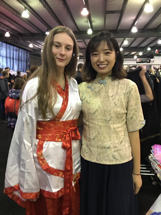 贺卡上用汉字写下对圣诞的祝福,不同的字体,相同的心声。还有一位当地朋友在中文的“圣诞快乐”下面用毛笔写下克语祝福,体验到了中国书法的乐趣。现场还准备了汉服,当地市民穿上汉服后,欣然与孔子学院教师合影留念。