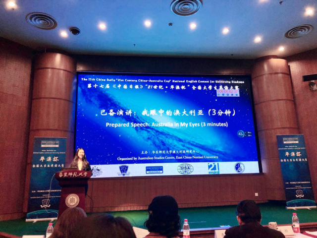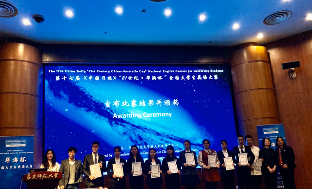 本届“华澳杯”全国大学生英语大赛由华东师范大学澳大利亚研究中心主办,吸引了来自全国包括北京外国语大学、南京大学、复旦大学等26所高等院校参赛。比赛由命题演讲“我眼中的澳大利亚”Australia in my eyes,即兴演讲以及澳洲知识问答三部分构成。我校曾柳妍同学在抽签序号为1号的情况下沉稳发挥,体现了极为出色的抗压和应变能力,由于澳知环节扼腕失分,最终获三等奖。