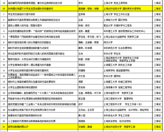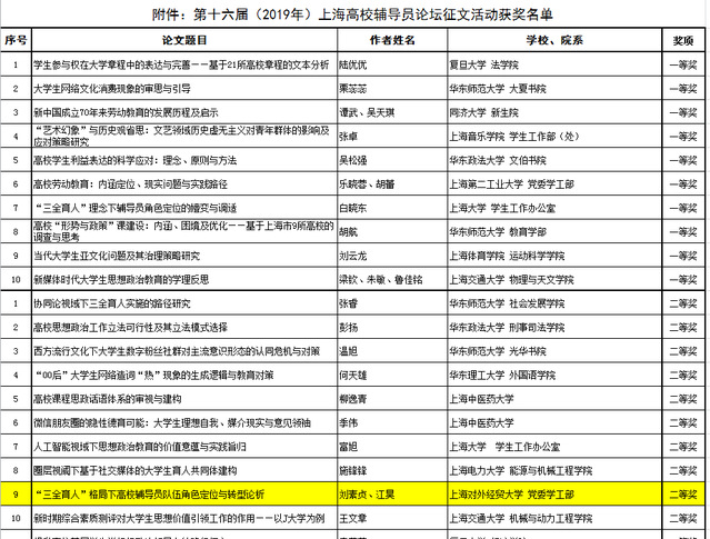本次征文活动经学校推荐、专家评审、综合评定,共评选出一等奖10篇,二等奖20篇,三等奖30篇。获奖论文将在“2019年度上海高校辅导员队伍建设月”总结会上予以表彰。