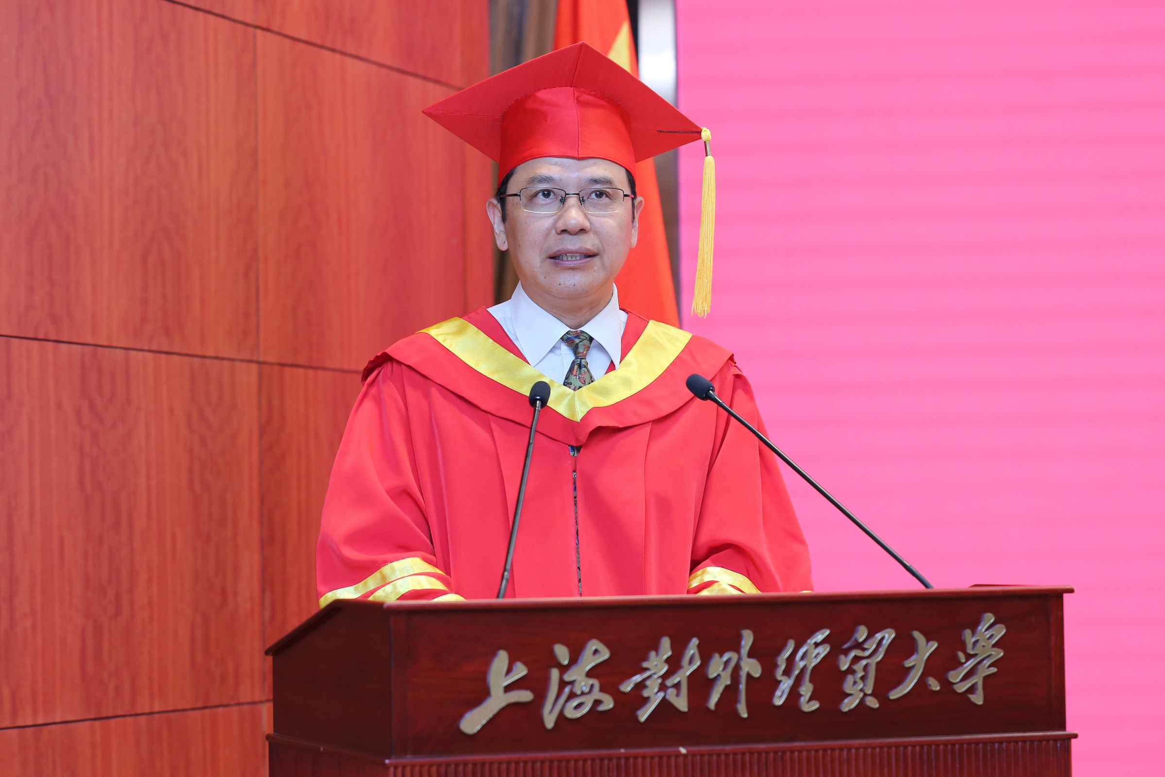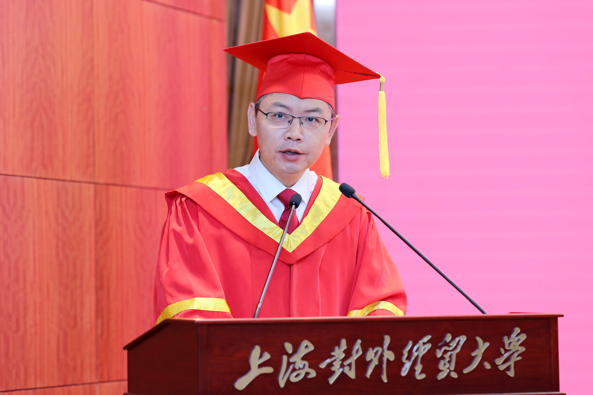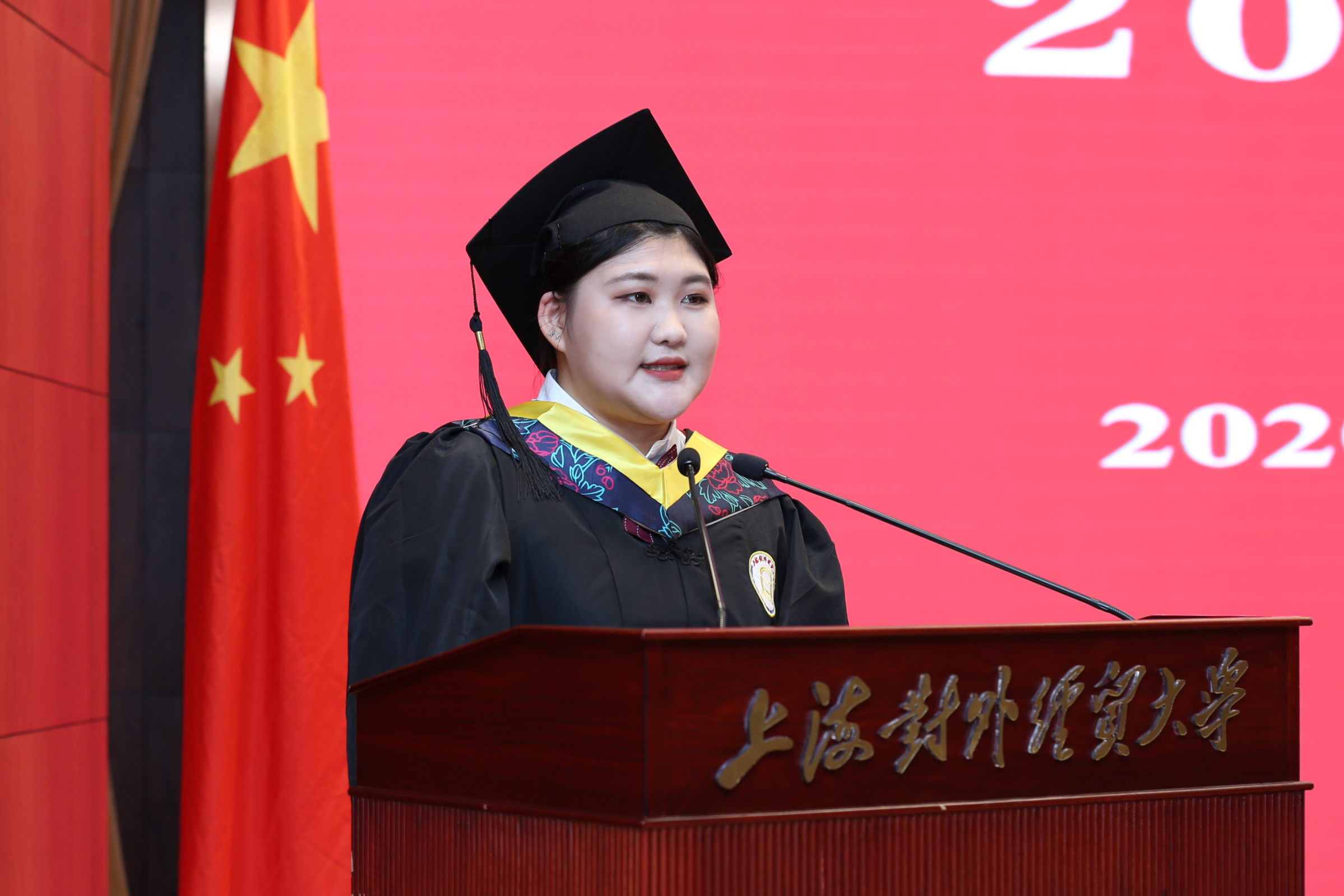 在毕业生离开校园,梦想启航之际,校长汪荣明以《直面时代,起而行之》为题为毕业生上了最后一课。他首先代表学校向全体毕业生表示热烈祝贺。他指出,2020届毕业生经历了前所未有的考验,用这种特殊的方式举行毕业典礼,虽有遗憾但意义深远,不平凡的2020年告诉了学生三个深刻的道理:世界上唯一确定的就是不确定;面对困难,唯强者自强;国是千万家、有国才有家。根据这三个道理,汪校长向毕业生提出三点殷切的希望:一是面对不确定,要学会以静生慧;二是面对风雨,要保持翱翔的姿态;三是面对纷繁世界,要树牢家国情怀。在毕业生即将从母校再出发时刻,汪校长鼓励毕业生,母校是世界首批、国内唯一的WTO教席院校,并于去年在国际激烈竞争中夺得WTO亚太培训中心资格。目前,母校正站在新一轮腾飞的关口,作为高等教育星空中一颗闪亮的星星,将照亮毕业生前行的道路。最后,汪校长祝福全体毕业生在今后的征途上前程似锦、鹏程万里,希望大家常回家看看。