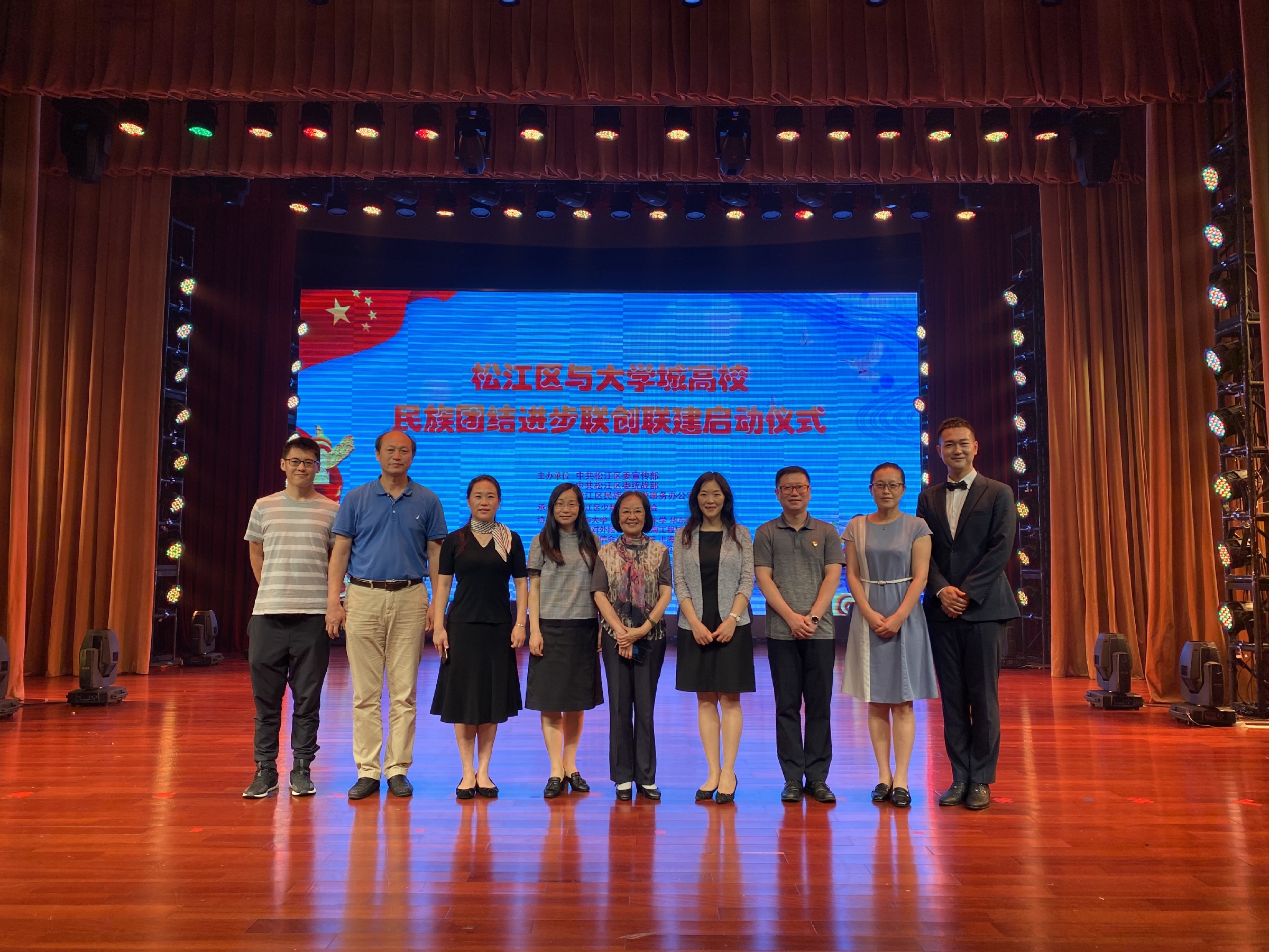 近日,松江区与大学城高校举行民族团结进步联创联建启动仪式,市民族宗教局副局长杜宇平,区委副书记肖文高,区委常委、统战部部长吴继华等出席。学校党委书记殷耀,党委统战部部长王群应邀出席启动仪式。