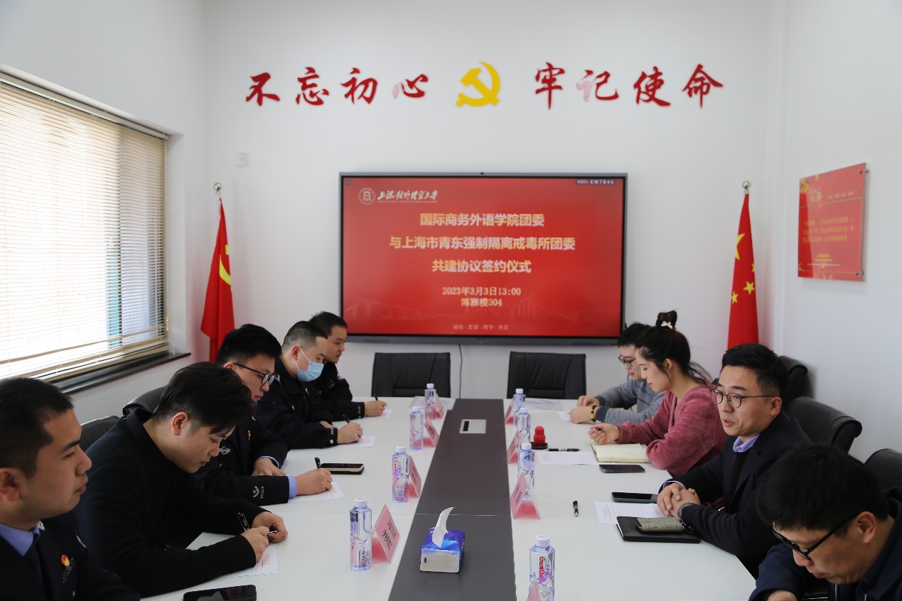3月3日下午,国际商务外语学院与上海市青东强制隔离戒毒所团委结对共建签约仪式在松江校区博雅楼304举行。上海市司法局团工委满剑、市戒毒管理局团委书记肖竞、市青东强制隔离戒毒所政治处副主任王文进、国际商务外语学院党委副书记徐峰、学工办主任程栋、团委书记罗文秀、本科生党支部书记张飞越、教学秘书费振弘及青东戒毒所相关科室人员出席。仪式由徐峰主持。