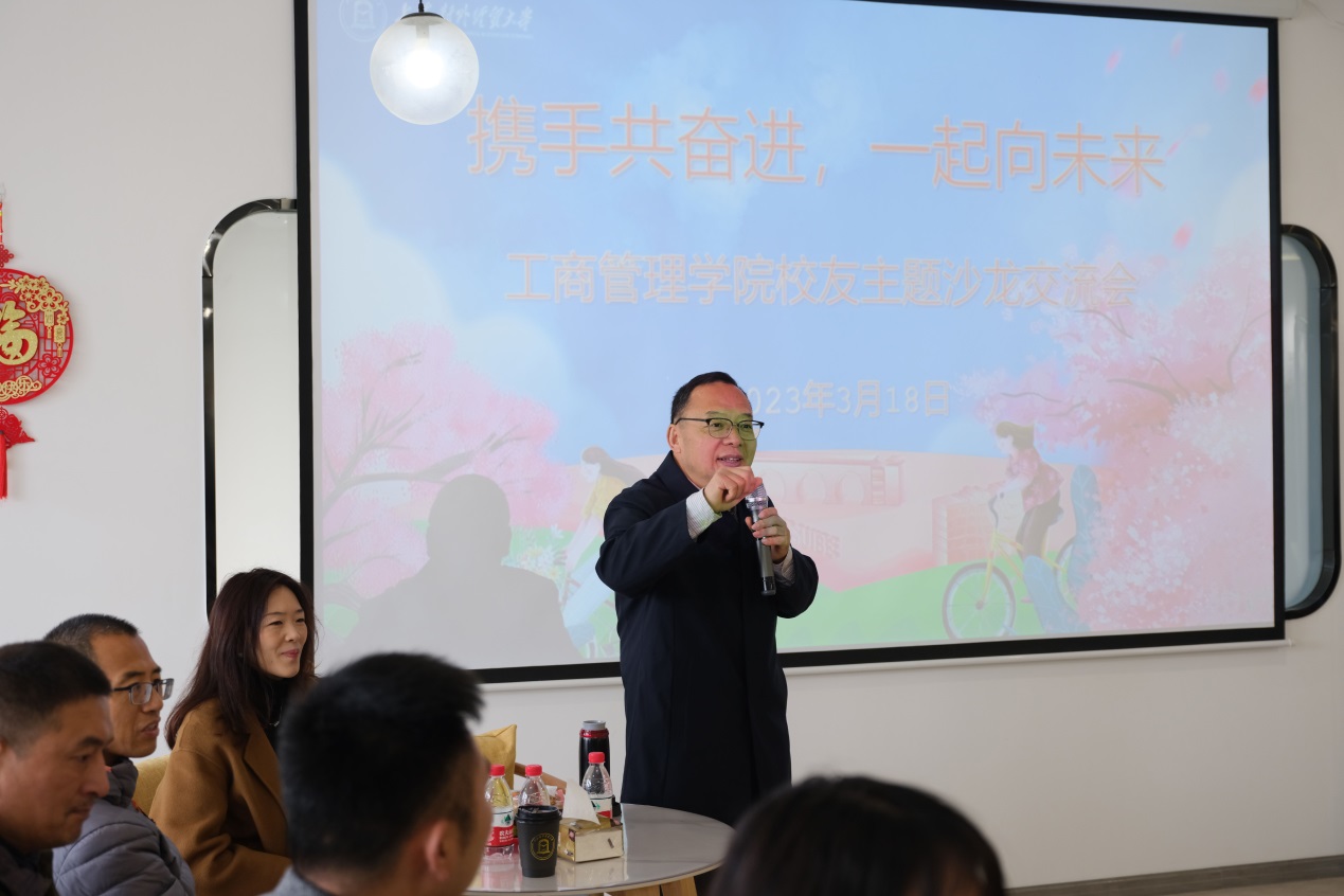 工商管理学院师生代表与返校校友齐聚学校教工之家,以“携手共奋进,一起向未来”为主题开展校友沙龙交流会。武增勇对校友的到来表示由衷的欢迎和感谢,他将学院目前正在积极的推进BGA国际认证和申博工作向校友们作了介绍,希望不断搭建学校与校友之间的互动平台,实现学校发展与校友发展同心同向、同频共振。张瑞娟就发挥校友联动力量,开展学院访企拓岗工作进行介绍,她指出未来将设立学院校友返校日、聘任校友成为职业生涯规划老师、搭建校友信息网络专项服务平台等,充分发挥校友传帮带的积极作用。