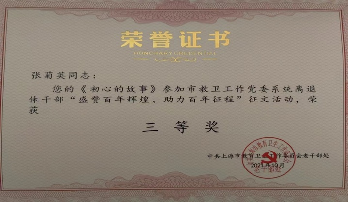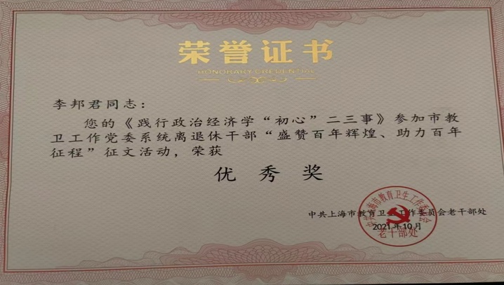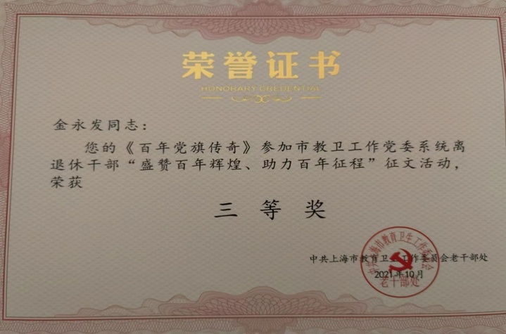 日前,学校收到教卫党委老干部处颁发的“盛赞百年辉煌、助力百年征程”征文获奖证书,金永发同志的《红船的故事》、《百年党旗传奇》分获二、三等奖;张菊英同志的《初心的故事》获三等奖;李邦君同志的《践行政治经济学“初心”二三事》获优秀奖。