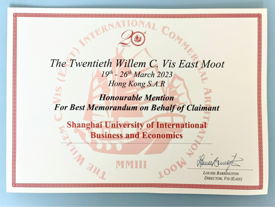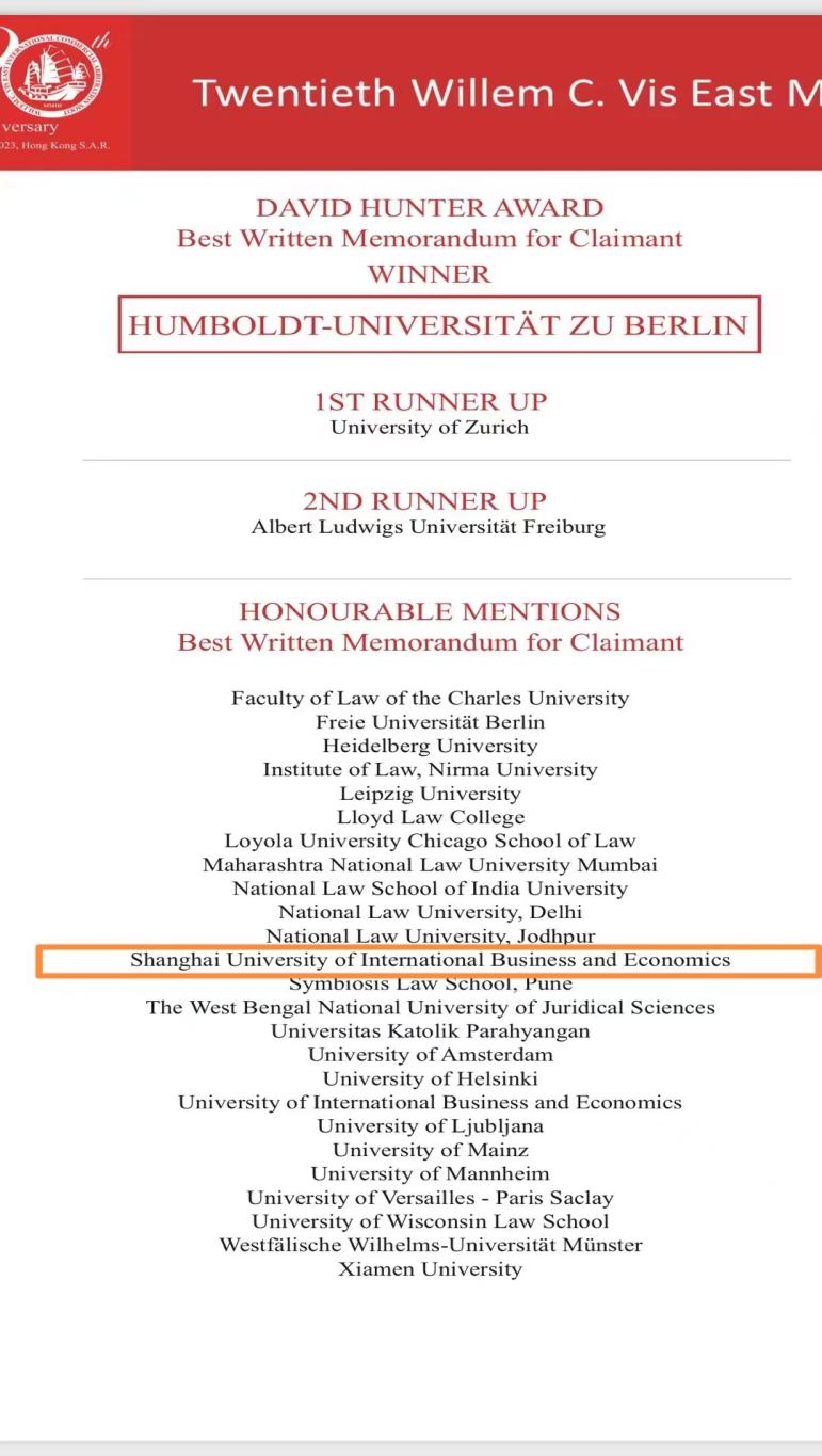 3月26日,第20届国际商事模拟仲裁庭赛事“Willem C. Vis East Moot”在中国香港落下帷幕。我校代表队在众多名校中突出重围,荣获全球最佳申请人书状荣誉提名奖(Honorable Mention for Best Memorandum on Behalf of Claimant)。