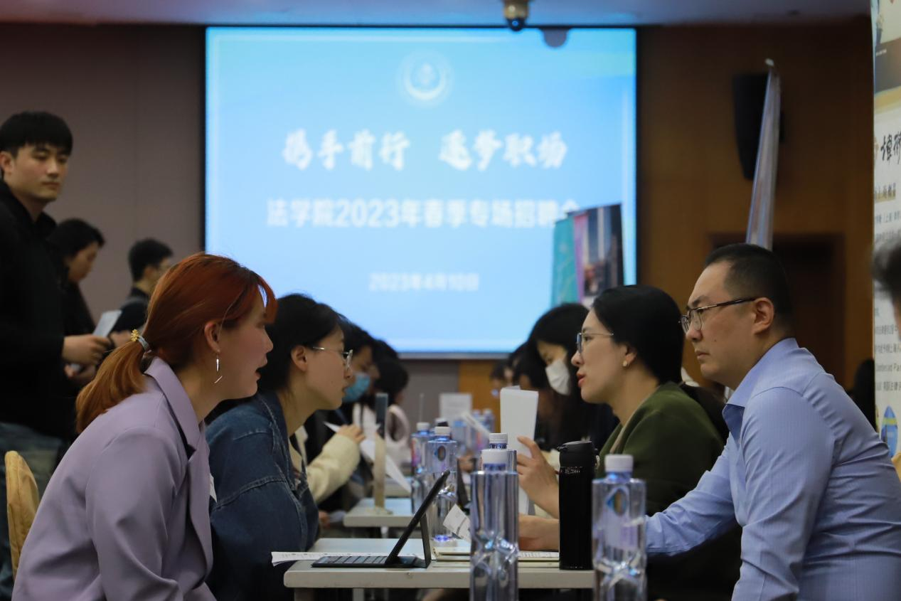 为深入学习党的二十大精神,实施就业优先战略,强化就业优先政策,贯彻落实党中央、国务院“稳就业”“保就业”决策部署,抢抓春季用人单位招聘关键期,法学院于4月10日下午在信息楼526会议室举行“携手前行,逐梦职场”2023年春季专场招聘会,助力毕业生更充分就业,引导学生梳理职业规划意识。校招生就业处处长魏舒、法学院党委书记黄静等到会指导,并与用人单位、学生进行亲切交流,了解单位招聘和学生求职情况。