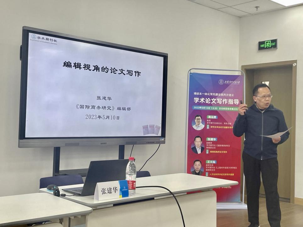 张建华以“编辑视角的论文写作”为主题,介绍了全国中文核心期刊《国际商务研究》,结合自己十多年的编辑工作经验,重点针对学术论文的题目选择、摘要与关键词撰写、引言和政策建议写作等做出指导,建议学生多看高水平论文,多写学术论文,在积累中逐渐提高写作能力。