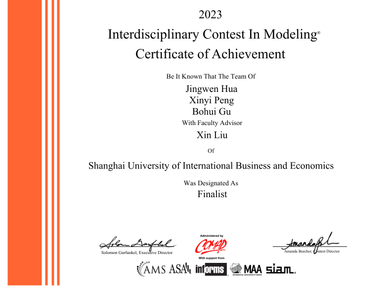 近日,2023年第39届美国大学生数学建模竞赛(MCM/ICM)成绩揭晓,我校学生再创佳绩,荣获国际特等奖提名奖3项(Finalist奖),国际一等奖4项(Meritorious奖),国际二等奖14项(Honorable奖),国际三等奖61项(Successful奖),其中获国际特等奖提名的三支参赛团队分别为:朱芳阳(20级国际经济与贸易)、曾雨青(20级国际经济与贸易)、刘鑫桢(20级国际经济与贸易)3位同学组成的参赛团队,指导教师:统计与信息学院刘永辉教授;胡悦(20级物流管理)、张雨青(21级数据科学与大数据技术)、陈易筱(21级国际投资)3位同学组成的参赛团队,指导教师:统计与信息学院王利娟副教授;华婧雯(20级金融学)、彭欣怡(19级贸易统计创新实验班)、顾博慧(20级金融学)3位同学组成的参赛团队,指导教师:统计与信息学院刘欣副教授。