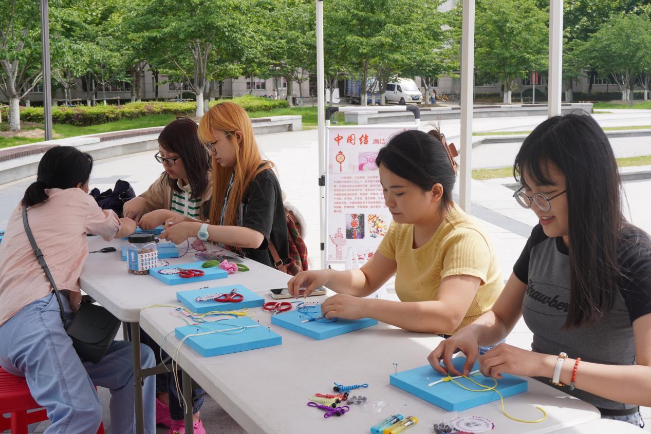 开幕式结束后,在“传统文化集市”进校园活动中,叶榭社区学校教师、“非遗”传承人为同学们现场教授叶榭软糕、丝网花、绳编草帽、香囊制作、叶榭竹编、叶榭筘布手作、扭扭棒花束、木贴画、金属丝弯折、中国结等传统手工,同学们现场互动体验,感受传统文化的熏陶。