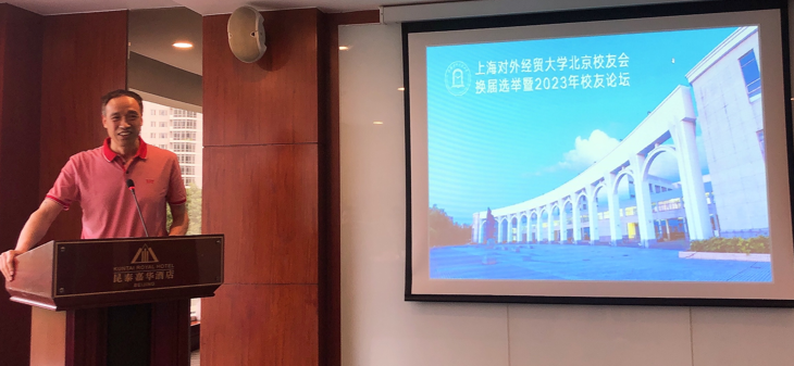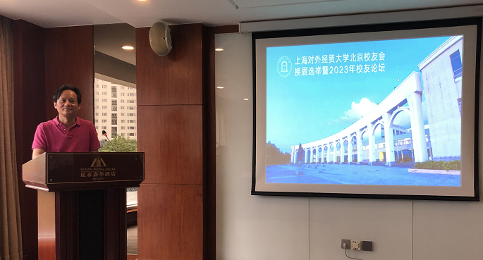 上海对外经贸大学北京校友会换届选举暨2023年校友论坛于5月20日下午在北京昆泰嘉华大酒店三楼会议厅举行。校友工作联络处处长晏琼、国际商务外语学院党委副书记徐峰、校友工作联络处相关同志以及在北京的校友近50人参与了此次会议。