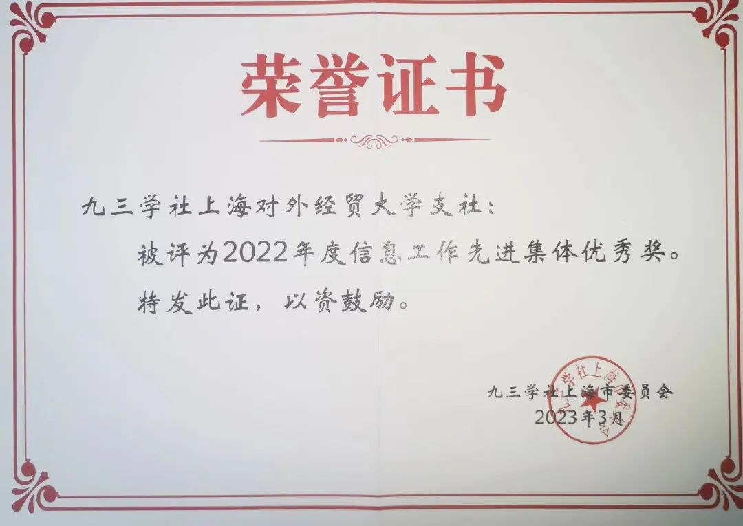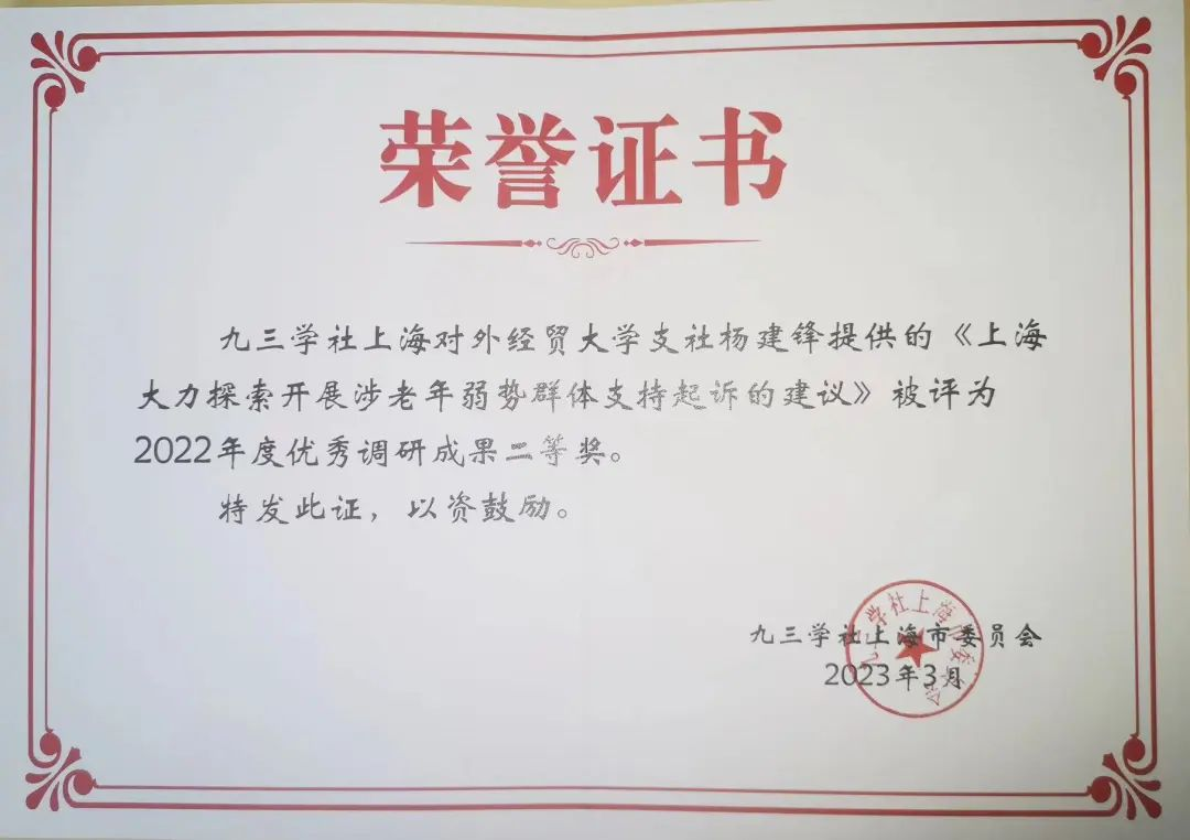 我校九三支社在2022年度参政议政工作方面成绩显著。九三学社上海对外经贸大学支社荣获2022年度参政议政工作先进集体二等奖、2022年度信息工作先进集体优秀奖表彰。杨建锋社员撰写的《上海大力探索开展老年弱势群体支持起诉的建议》荣获2022年度优秀调研成果二等奖。