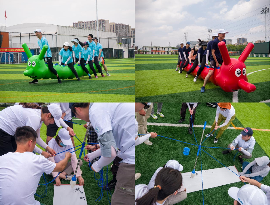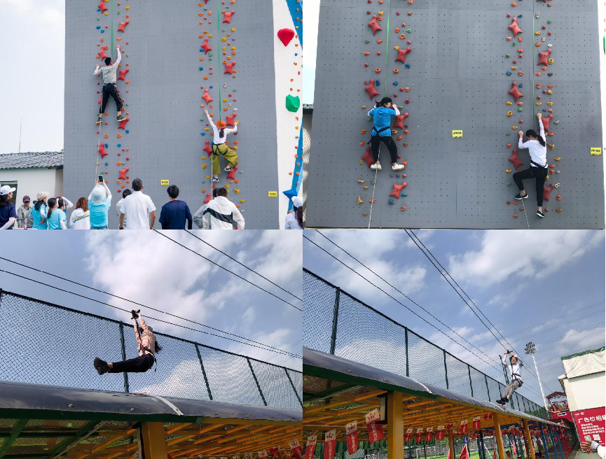 活动伊始,全体参与人员组成五支队伍,在专业教练的带领下进行了热身运动。随后,五支队伍正式展开“同舟共济”“神笔马良”“攀岩长征”“同心滑索”等项目的比拼和体验。