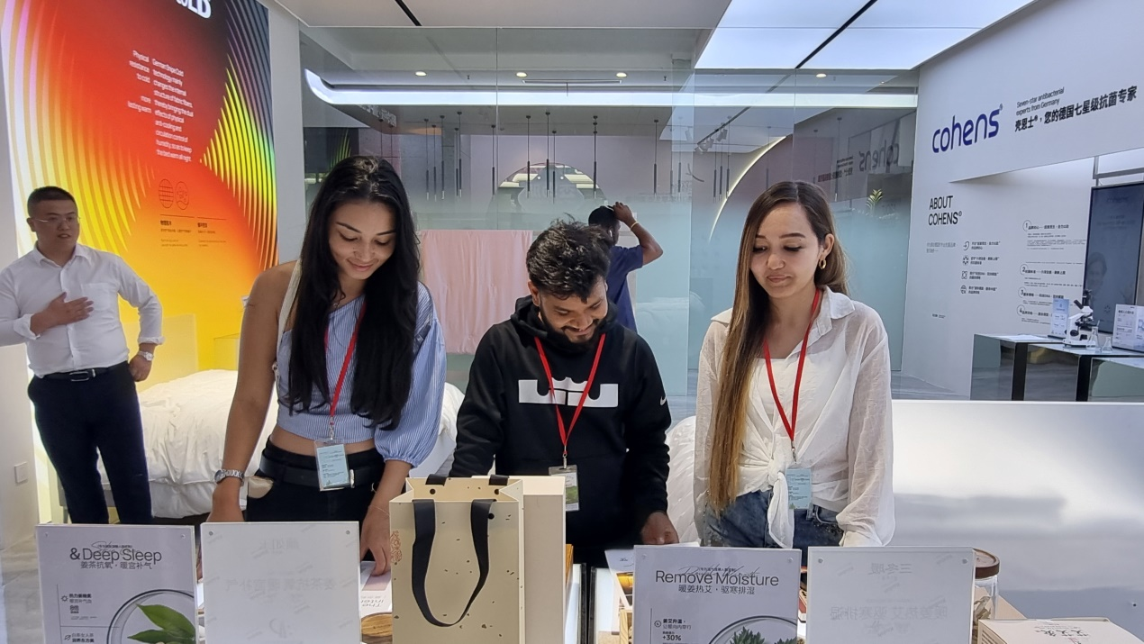 留学生们走进叠石桥家纺城,深入家纺企业展厅,看着琳琅满目的家纺产品,亲自体验最前沿的家纺产品,听着工作人员们的细致讲解,了解了南通家纺产业的进出口贸易发展和市场占有率,感叹于南通家纺业在全国家纺业中举足轻重的地位,真切感受到新时代南通家纺产业与“一带一路”的交织互融。